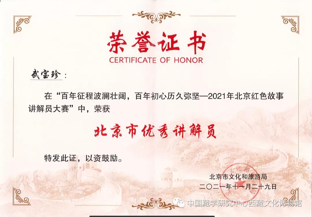 近日,北京市文化和旅游局(以下簡稱市文旅局)“2021年北京紅色故事講解員大賽”評選結果揭曉,中國藏學研究中心西藏文化博物館被評為“優秀組織單位”,選送的志愿講解員武寶珍被評為“北京市優秀講解員”。