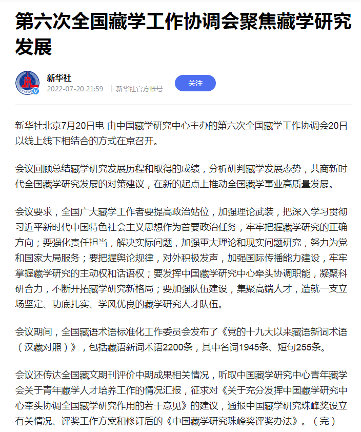 7月20日至21日,第六次全國藏學工作協調會在北京召開。近日,人民日報、新華社、中央廣播電視總臺、光明日報、中國日報、中國新聞社等中央主要媒體及所屬新媒體平臺,運用文字、圖片、視頻等多種形式,集中對本次會議情況刊播新聞報道,展現了全國廣大藏學工作者以習近平新時代中國特色社會主義思想為指導,共商新時代藏學研究發展對策建議、在新的起點上推動全國藏學事業高質量發展的生動實踐。