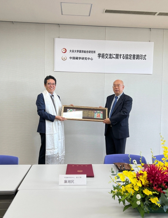 9月13日,中國藏學研究中心副總干事廉湘民率學術代表團一行6人訪問日本大谷大學。當天上午,藏研中心與大谷大學學術交流暨合作協議簽訂儀式在大谷大學真宗綜合研究所舉行。儀式由大谷大學真宗綜合研究所藏學辦公室負責人三宅伸一郎教授主持。廉湘民出席會議并致辭,大谷大學真宗綜合研究所所長廣川智貴致歡迎辭。會上,廉湘民與廣川智貴代表藏研中心和大谷大學真宗綜合研究所簽訂了合作協議。隨后,代表團一行參觀了大谷大學圖書館。
