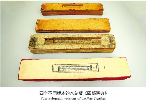 四個不同版本的木刻版《四部醫典》。西藏自治區藏醫院文獻研究所提供